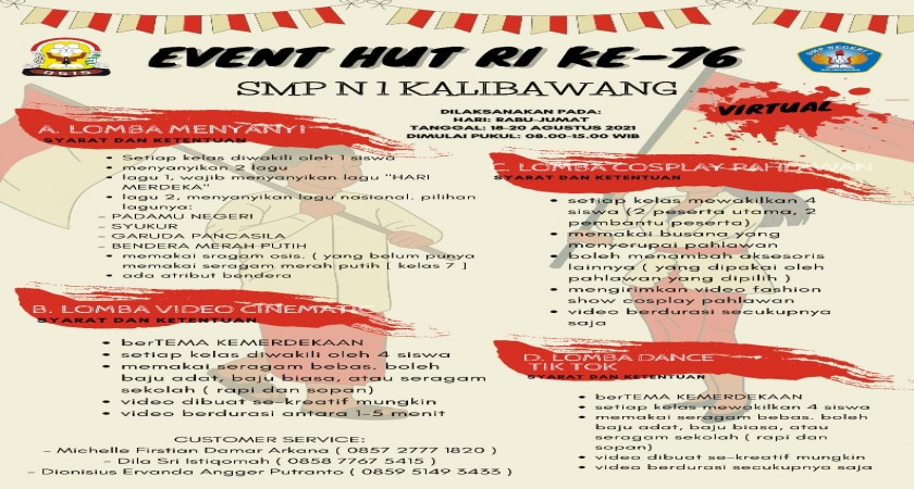 Pandemi ini memang mengubah segala lini kehidupan, termasuk kegiatan-kegiatan siswa yang seharusnya menjadi pemecah stress dan lelah di tengah padatnya pembelajaran di sekolah, tetapi sayang sekali kegiatan-kegiatan seru siswa ini harus ditunda untuk waktu yang tidak ditentukan. Namun, bukan siswa SMP N 1 Kalibawang jika hanya berdiam diri saja. Kreatifitas tanpa batas siswa kebanggaan SPENSAKA ini (nama singkatan untuk SMP N 1 Kalibawang) yang dilakukan oleh Pengurus OSIS SPENSAKA untuk memeriahkan peringatan hari kemerdekaan RI yang ke 76. Sesuai dengan event-nya, kegiatan ini dimaksudkan untuk memperingati HUT Ke-76 RI sekaligus menambah semangat siswa dalam mengekspresikan dan mengoptimalkan potensi diri dalam karya yang beragam. Apa saja itu?
